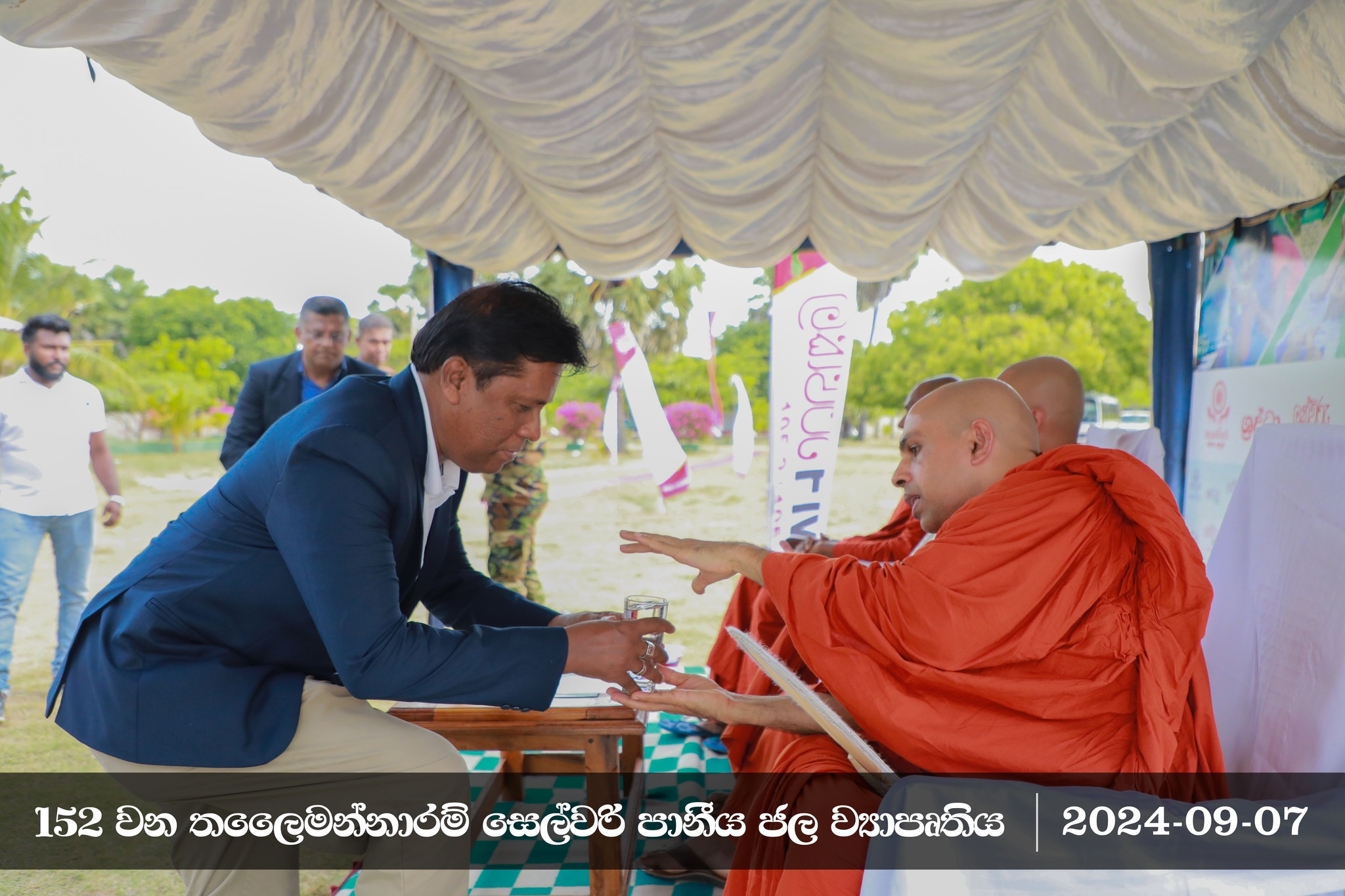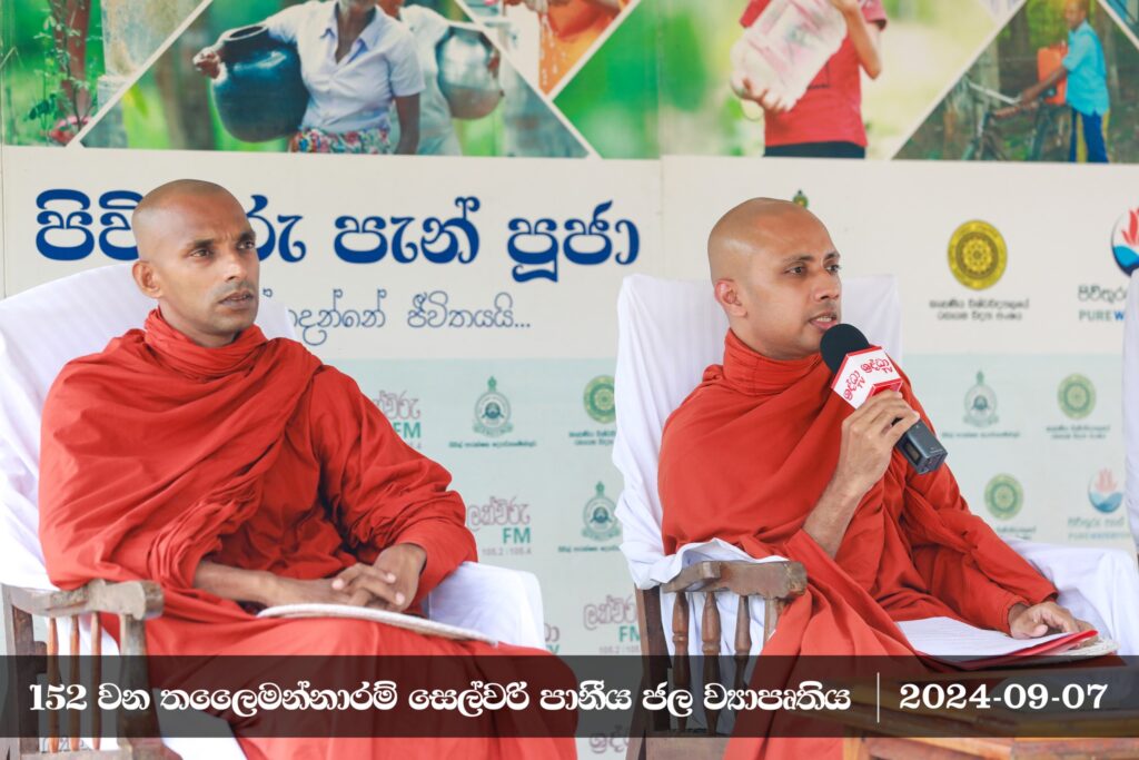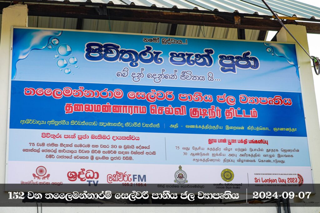 බැරලෝහ මිශ්ර අපිරිසිදු ජල පරිභෝජනය හේතුවෙන් අප මාතෘභූමියේ ප්රදේශ ගණනාවක පැතිර යන වකුගඩු අක්රීය වීමේ මාරාන්තික රෝගයෙන් පීඩාවට පත් අපේ ම සහෝදර ජනතාවගේ ජීවිත ඉන් සුරක්ෂිත කරනු පිණිස, මහමෙව්නාව භාවනා අසපු සංචිතය සහ ශ්රද්ධා රූපවාහිනිය මඟින් ක්රියාත්මක කළ 152 වන පිවිතුරු පැන් පූජා පුණ්ය ව්යාපෘතිය තලෛමන්නාරම සෙල්වරි ප්රදේශයේ දී ජනතා අයිතියට පත් කිරීමේ පුණ්ය මහෝත්සවය අතිපූජනීය මහා සංඝරත්නයේ ආශිර්වාද මධ්යයේ - 2024 සැප්තැම්බර් මස 07 වන දින පැවැත්විණි.