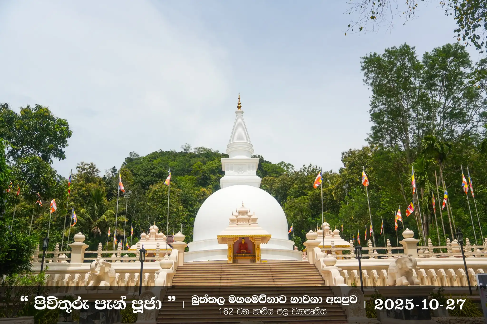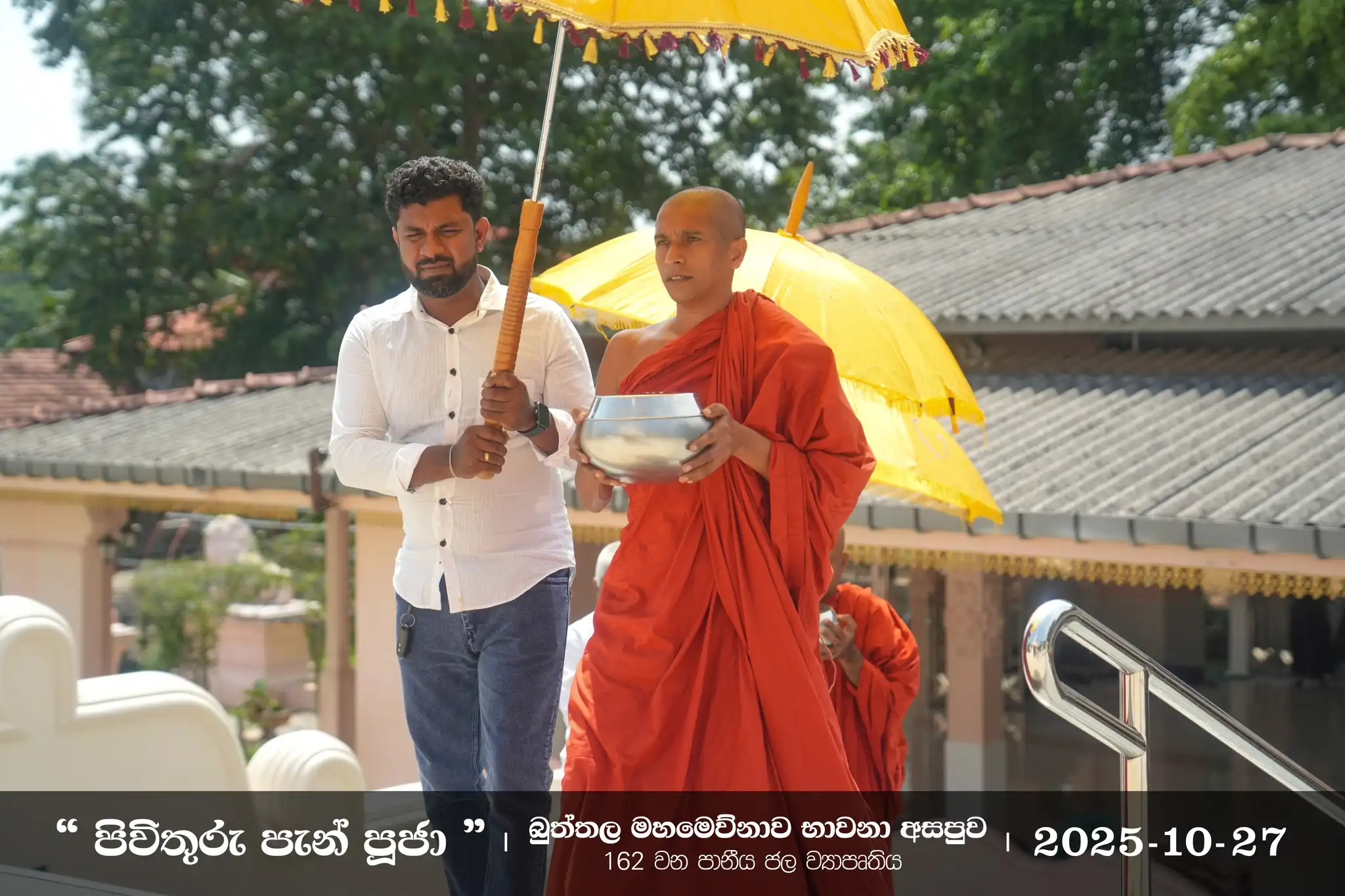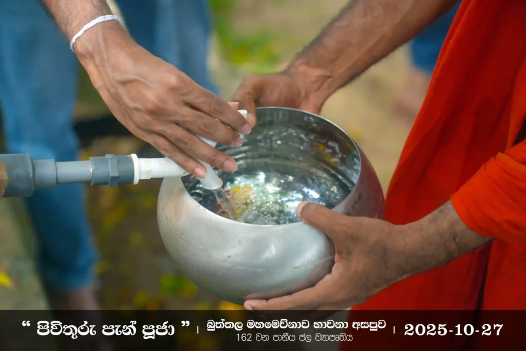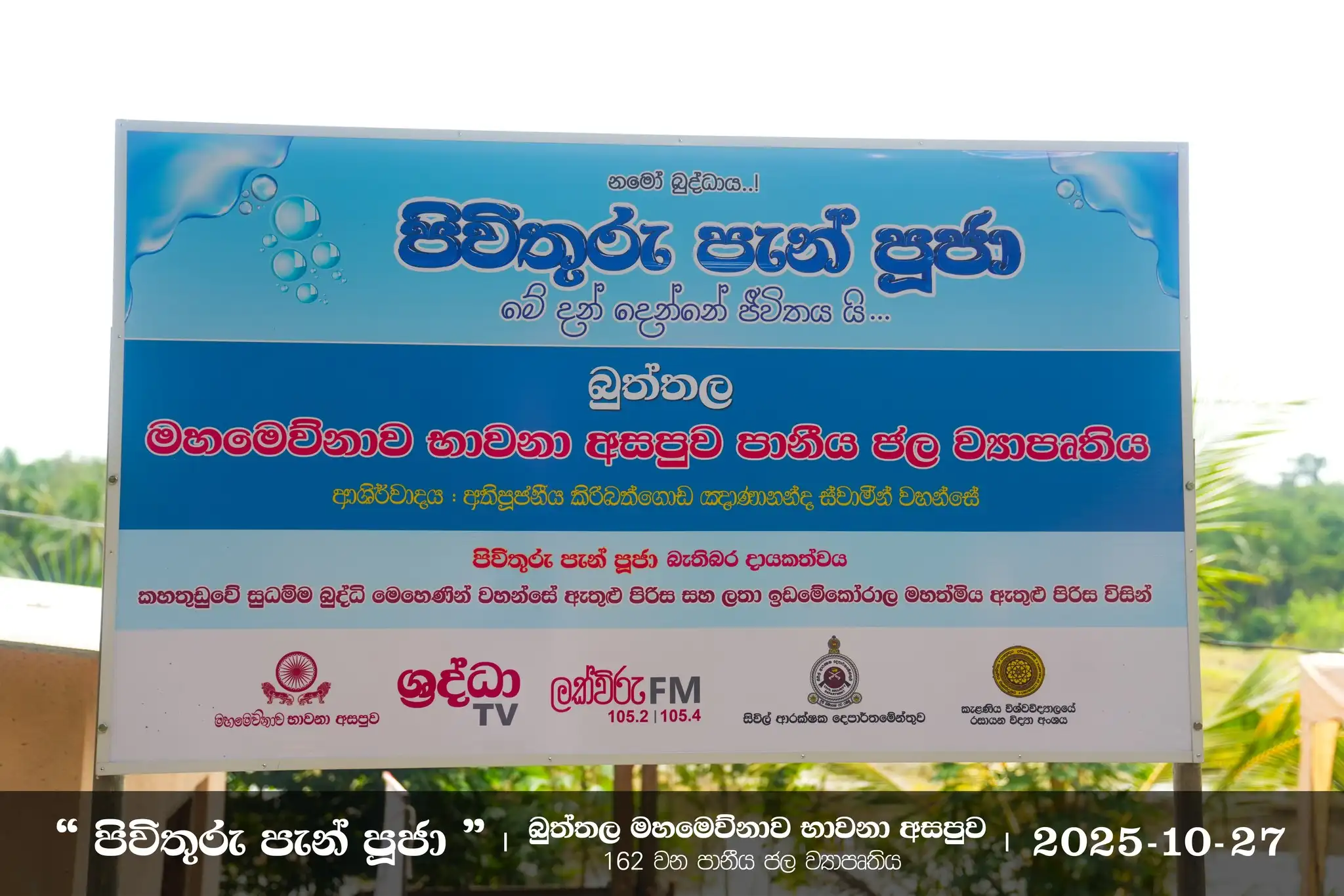 බැරලෝහ මිශ්‍ර අපිරිසිදු ජල පරිභෝජනය හේතුවෙන් අප මාතෘභූමියේ ප්‍රදේශ ගණනාවක පැතිර යන වකුගඩු අක්‍රීය වීමේ මාරාන්තික රෝගයෙන් පීඩාවට පත් අපේ ම සහෝදර ජනතාවගේ ජීවිත ඉන් සුරක්ෂිත කරනු පිණිස, මහමෙව්නාව භාවනා අසපු සංචිතයත්, ශ්‍රද්ධා රූපවාහිනියත් මඟින් ක්‍රියාත්මක කළ 162 වන පිවිතුරු පැන් පූජා පුණ්‍ය ව්‍යාපෘතිය බුත්තල මහමෙව්නාව භාවනා අසපු පරිශ්‍රයේ දී ජනතා අයිතියට පත් කිරීමේ පුණ්‍ය මහෝත්සවය අතිපූජනීය මහා සංඝරත්නයේ ආශිර්වාද මධ්‍යයේ 2025 ඔක්තොම්බර් මස 27 වන දින පැවැත්විණි.